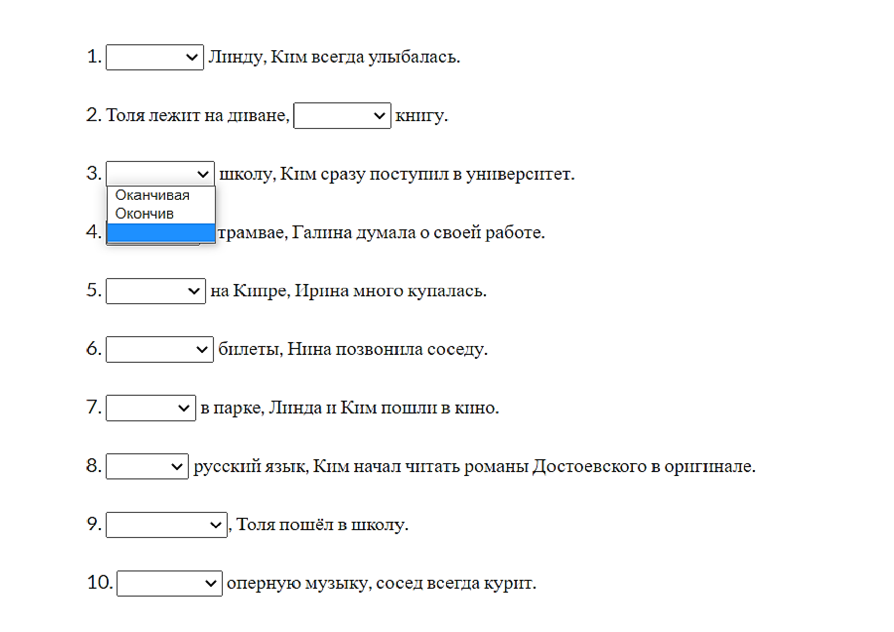8. ________ Russian, Kim started reading Dostoevsky’s novels in Russian. |