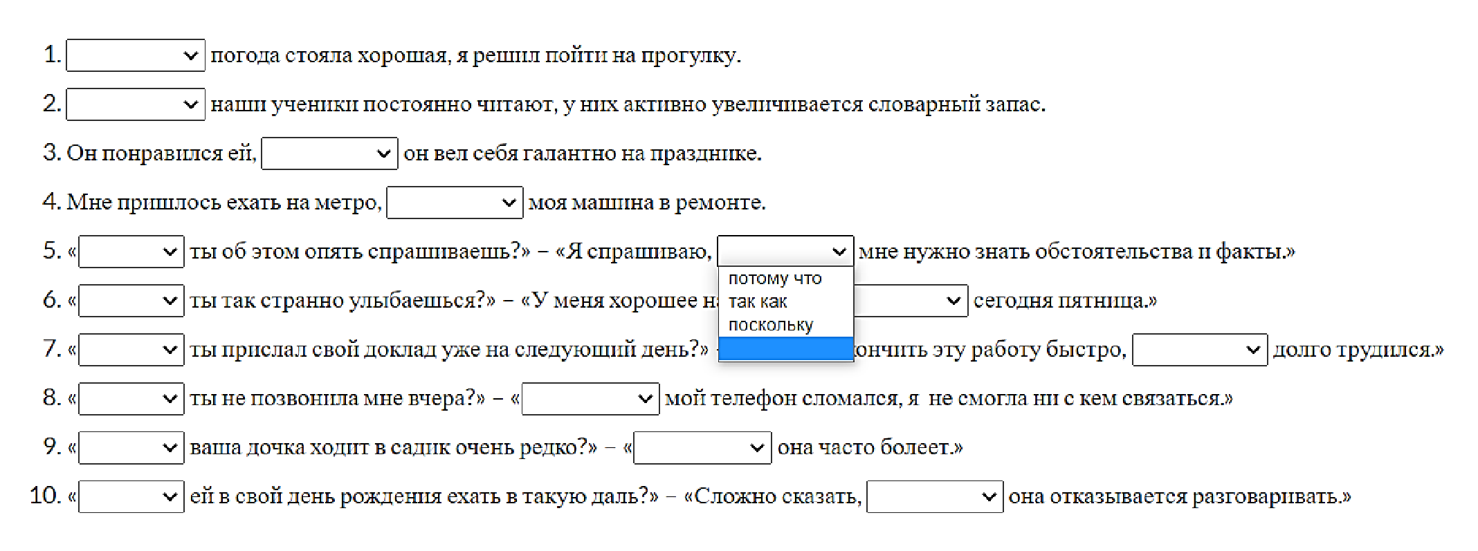 Type of exercise: linguistic. Substitution drills. Students fill in the gaps with appropriate words. Level: advanced. Students learn and practice the use of adverbs and conjunctions such as “because”, “as”, “since”. Learners analyze typical mistakes in speaking and writing.