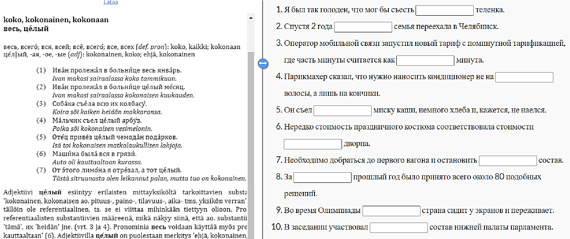 Two courses for freshmen and sophomores were created on the basis of the course described above. Students who learn the material on their own can refer to the texts in Finnish that are attached to each exercise. These texts include theoretical information and word usage examples analyzed in the practical part. The authors of the article analyzed the course “Venäjän sanastoharjoitukset I: miten sanat eroavat toisistaan?” (“Exercises on the vocabulary of the Russian language I: how do words differ from each other?”). 78 exercises are divided into three sections: “Verbs,” “Nouns” and “Other parts of speech”. The sentence-building exercises are based on the Newspaper subcorpus of the Russian National Corpus and the RuSkELL corpus. Below is a description of the exercise from the Unit “Other parts of speech”.