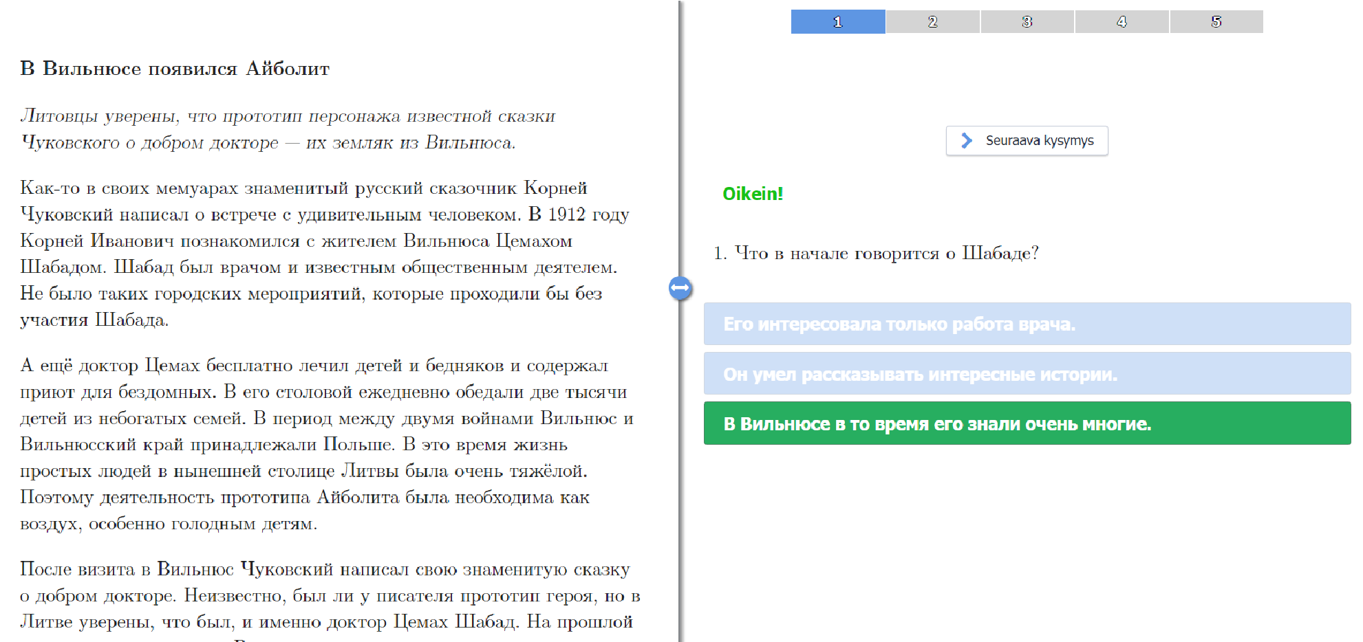 One of the courses popular with many language learners is “Venäjän abikurssi” (“Russian language course for applicants”). This course mainly includes the tasks that school leavers have to do when they take their high school graduation exam on the Russian language and when they take their entrance exams on the Russian language to enter the University of Helsinki. Some of the assignments are based on the texts from the Russian National Corpus and the Integrum database. All 55 vocabulary and grammar exercises are aimed at applicants who make a decision to major in the Russian language and literature. According to the working group, students taking this course find it easier to prepare for the entrance exams since applicants can look through the previous year test tasks and try to do them. Thus, they get an idea of the level of the applicants’ language competence. Below is a typical Reading Comprehension exercise: