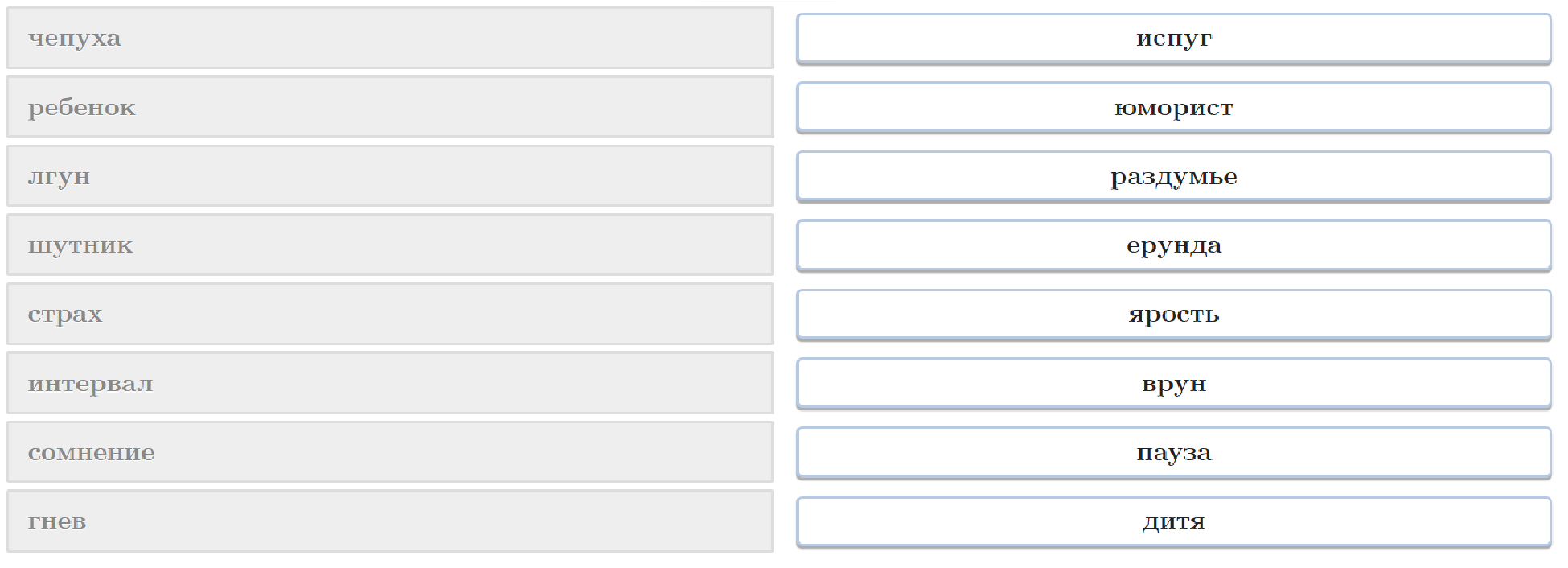 The two units of the course – “Synonyms (nouns)” and “Synonyms (adjectives)” – are devoted to polysemy. As for the exercises, students need to find synonyms, explain the lexical meaning of the words, focus on the synonymic row and replace a word in a sentence with a word similar in meaning. Below is a description of the exercises from the “Synonyms (nouns)” unit. Students need to find pairs of synonyms: