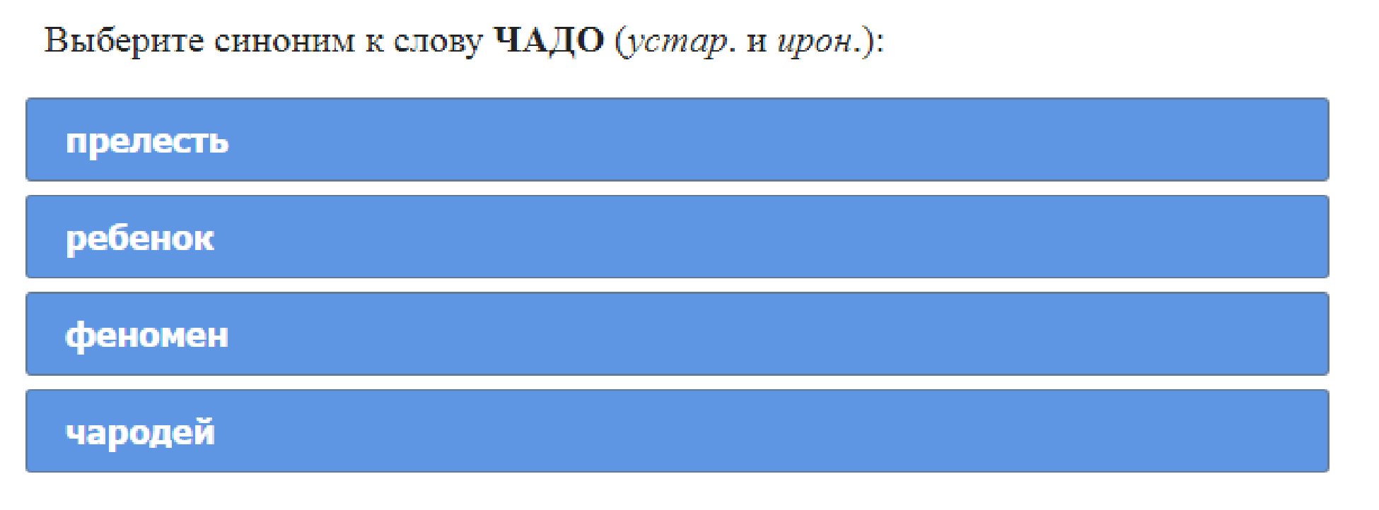 After students make an attempt to choose the correct option, the definition of the word and its synonyms pop up on the screen, which helps students to memorize the words. In addition, learners analyze how the words are used in sentences which were taken from the Russian National Corpus and the RuSkELL corpus. For example, students learn what the Russian word чадо (child) means and look through its synonyms.