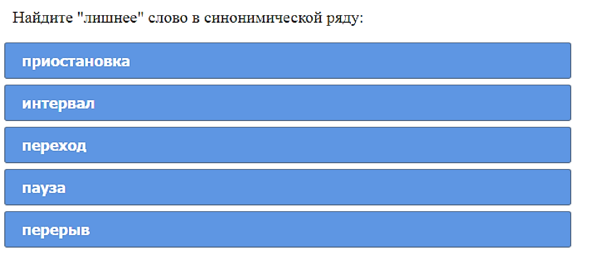 As for the next type of the exercises, students are required to focus on the concept of a synonymic row and find an “extra” word. Type of exercise: a multiple-choice test. Level: intermediate. Students do the exercise and memorize the meanings of the words; they match synonyms, apply the methods of cognitive task analysis and synthesis, and enlarge their active vocabulary. The task description also contains the definitions of such linguistic terms as “synonymic row” and “dominant synonym”. For example, students are required to find an extra word in the synonymic row: