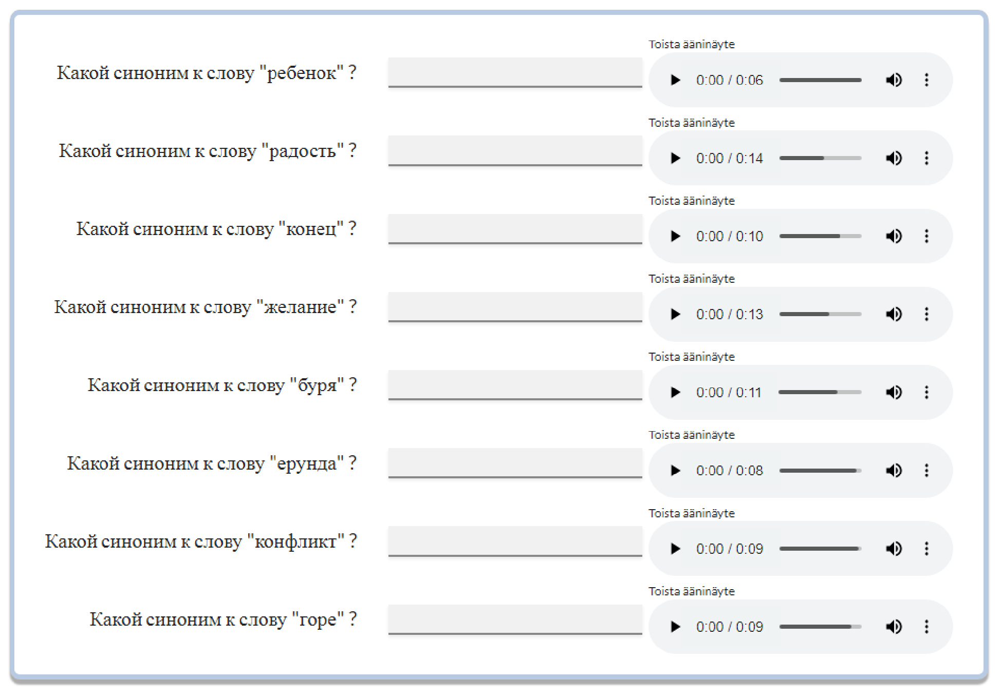 The next type of exercises is based on the audio recordings extracted from the video files of the Russian National Corpus. The audio is recorded in MP3 format and the length of the recordings is 10–20 seconds. To do the task students can listen to the audio files several times. Students practice their listening skills, try to extract the necessary information (finding the necessary synonym in the stream of speech) and write down the word in its initial form.