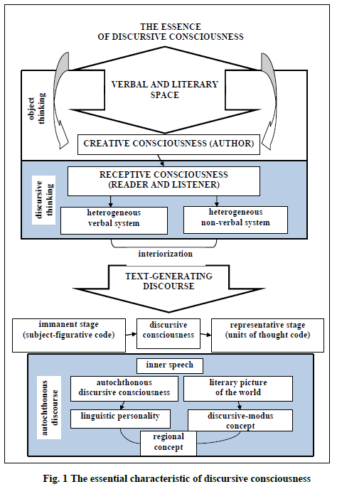In the center of verbal and literary space of discursive thinking is a person: the recipient himself (listener or reader), the author and characters in a particular subject environment. In other words, verbal and literary space is anthropocentric and objective. This principle presupposes the actualization of such an important category for verbal and literary creativity as autochthonous creative discursive consciousness. The consciousness of a text-generating subject is based on ethno-linguistic autochthonousness, spontaneously built into the episteme (Alefirenko, 2019), cultural and cognitive a priori, which sets the conditions for forming the linguo-ethno-cultural architectonics of text.