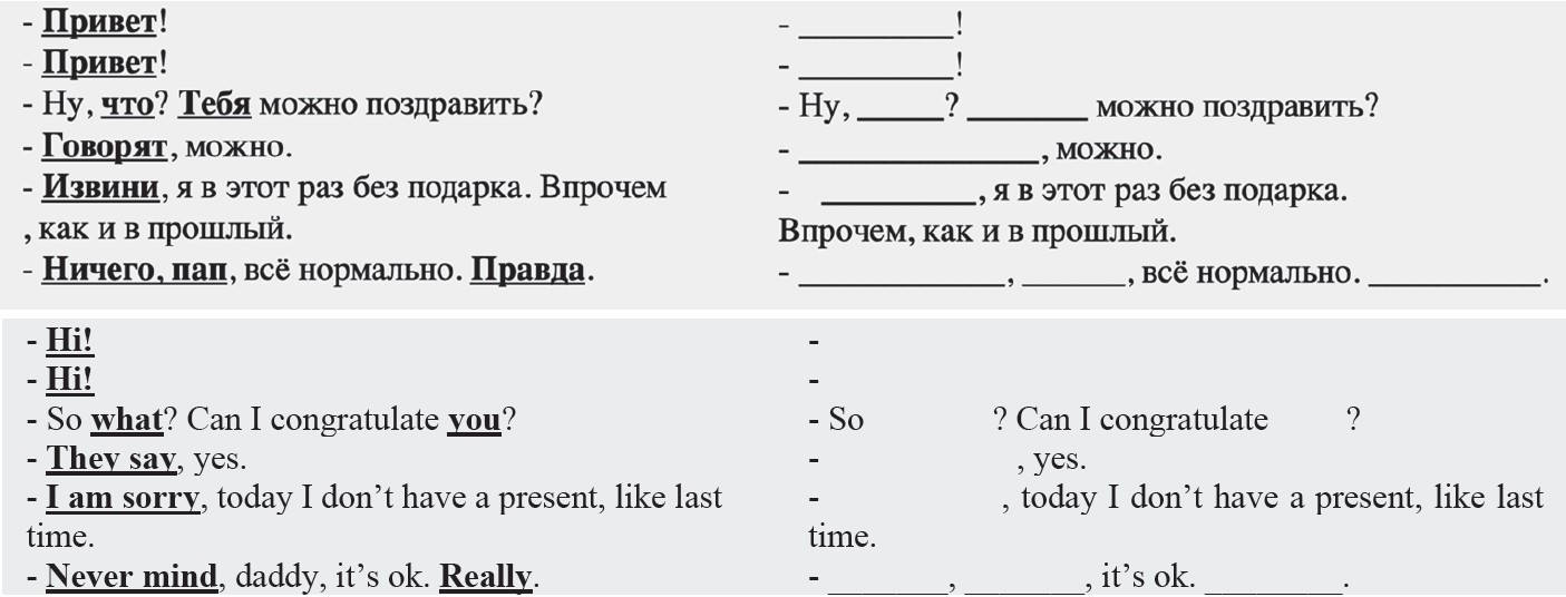 На подготовительном этапе работы инофонам предлагается самостоятельно прочитать каждый диалог с пропусками (рис. 2, справа) и просмотреть видеоматериал без звукового сопровождения. Такое задание способствует, с одной стороны, психологическому настрою инофона на аудирование и, с другой стороны, активизации когнитивных процессов и, в частности, механизма языковой догадки непосредственно перед прослушиванием. На этом этапе активизируется речевой навык чтения. На основном этапе учащиеся просматривают видеоматериал и заполняют пропуски (активизация навыков аудирования и письма). Количество предъявлений не ограничено. Заключительный этап проходит на занятии: чтение по ролям и обсуждение фрагмента (формирование навыка чтения и говорения). Так, внимание учащихся может привлечь редуцированная форма обращения (как «пап» в вышеуказанном примере), объяснение которой за редким исключением представлена в современных учебно-методических пособиях. При работе с аутентичными материалами на уроках РКИ появляется возможность восполнить такие пробелы, поскольку учащиеся сталкиваются с реальным использованием языка в бытовой сфере общения.