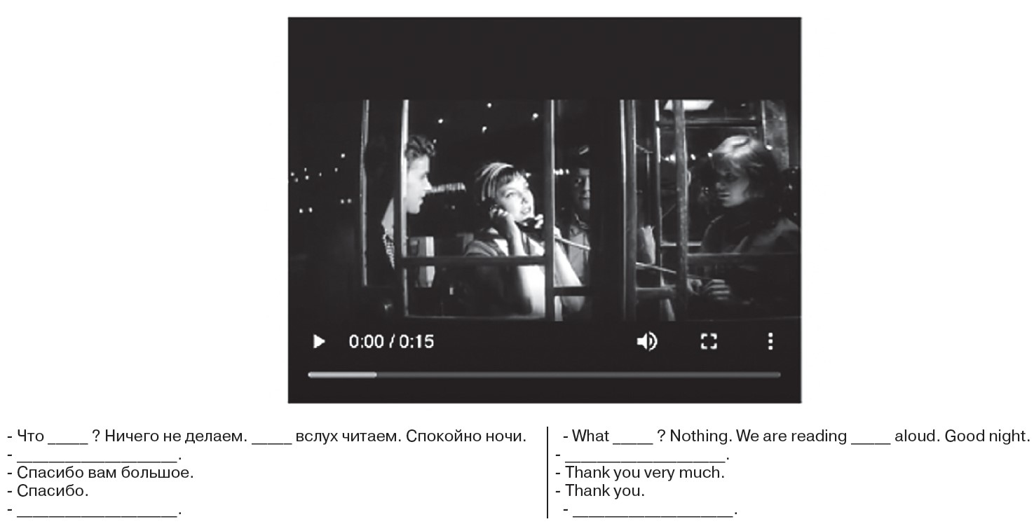 Ярким примером важности контекста и механизма языковой догадки может служить одно из заданий, разработанное авторами статьи. Несмотря на довольно быстрый темп речи в видеоотрывке из культового фильма «Я шагаю по Москве» и незнакомый лексический элемент («вслух»), большинство учащихся в обеих группах смогли угадать пропущенные слова благодаря повтору в диалоге («ничего не делаем»), компенсаторному умению («читать книгу») и логическому умозаключению (формула вежливости «спасибо» – «не за что») (рис. 3).