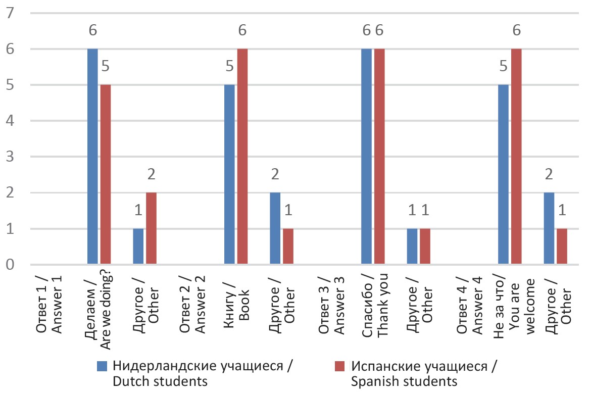 Стоит отметить, что сравнительно-сопоставительный анализ полученных данных в обеих группах (правильных и неправильных ответов учащихся испанской и нидерландской групп) не выявили ярко выраженных различий в восприятии речи носителей языка на слух.