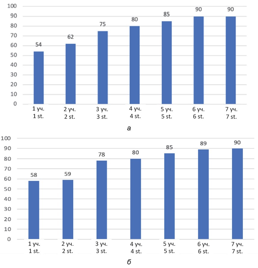 Сравнивая оба графика (рис. 9), можно отметить, что у преобладающего большинства учащихся в обеих группах (71 %) достаточно высокая оценка по выполнении итогового задания (75–95 из 100). Результаты у 29 % учащихся можно считать пороговыми. Основные сложности в выполнении заданий обусловлены рядом причин: темп речи, тембр голоса, дикция, посторонние шумы, громкость, эхо, индивидуальные особенности восприятия речи на слух инофона, др.