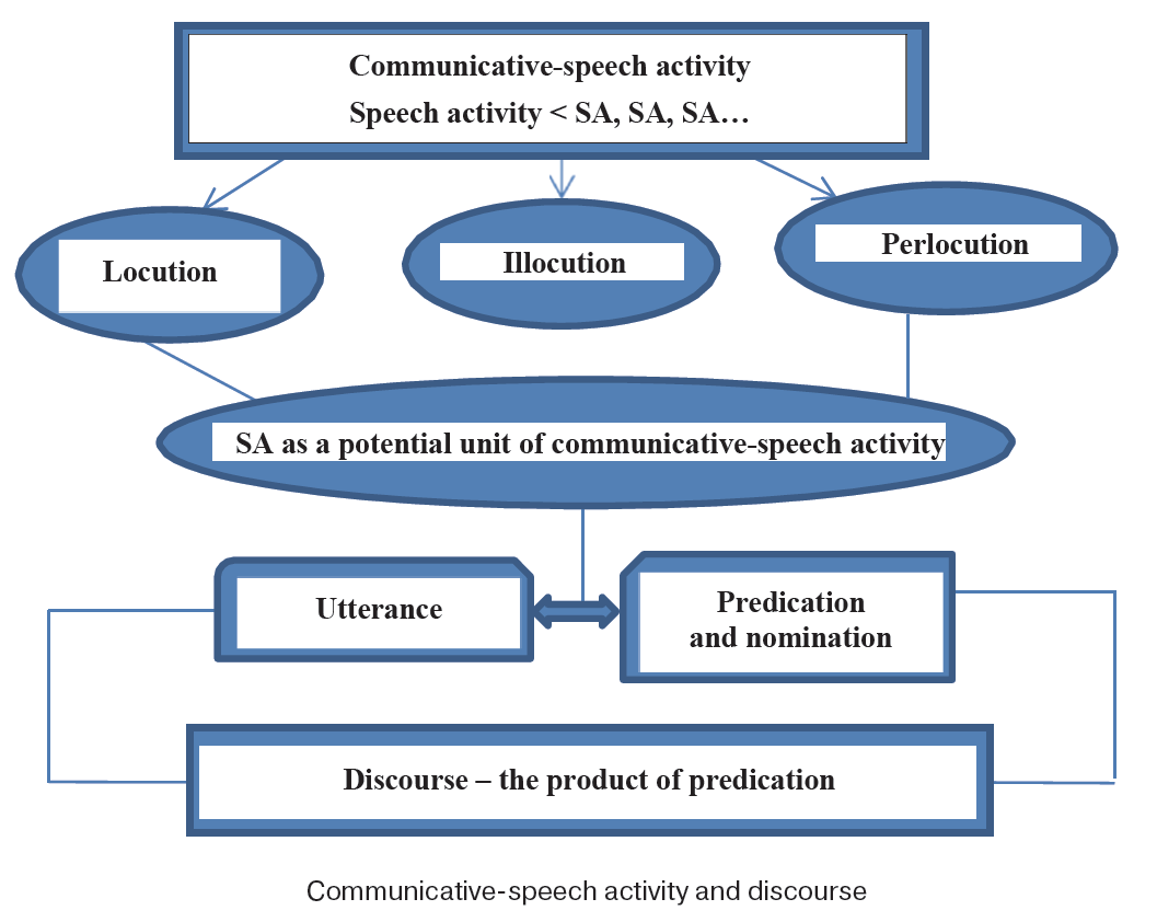 Thus, the SA is realized in the utterance. Through utterances SA as a potential unit of communicative and speech activity forms the discourse. In this context, a distinction is made between a potential and a real utterance. The potential utterance is a category of psychology of speech. It emerges at the stage of internal programming as a basis for producing a speech utterance (see: Leontev, 2007). According to A.A. Leontev's concept, the initial stimulus for generating an utterance is the motive for communicative intention, which leads to the inner speech intention, when the theme, the topic of the statement, and the rheme (what exactly the author is going to say about the given object of thought) are identified. After establishing the connection between the presupposition (~ theme) and the target (~ rheme), the processes of predication and nomination start, and the real speech utterance is formed. Discourse serves as the speech-thought mechanism for utterance generation. The purpose of discourse is to establish semantic links between the acts of predication and nomination forming a discursive model (~ structural scheme) of the utterance.