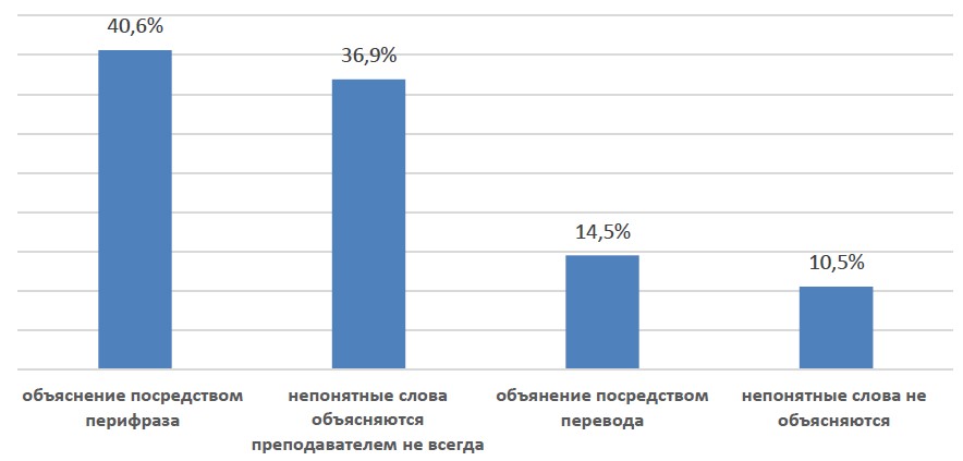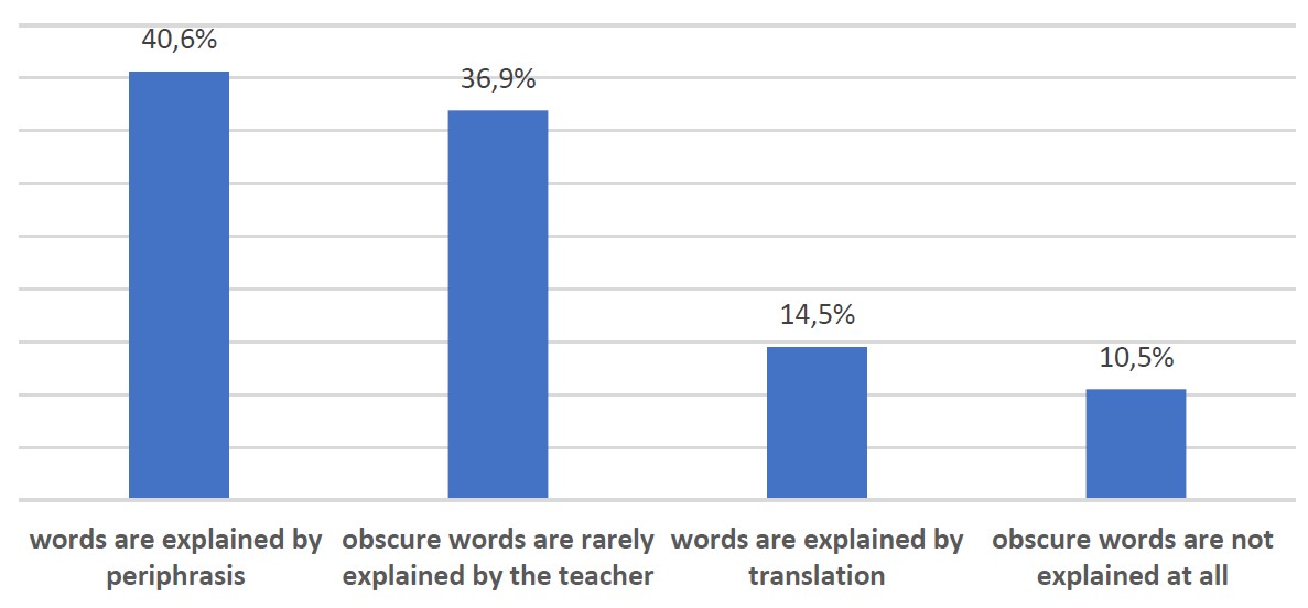 Foreigners said that new terms and unfamiliar words were explained in general by means of periphrasis (40.6%) or translation (14.5%). At the same time, students pointed out that obscure words were rarely explained by the teacher (36.9%) or were not explained at all (10.5%) (Figure 4).