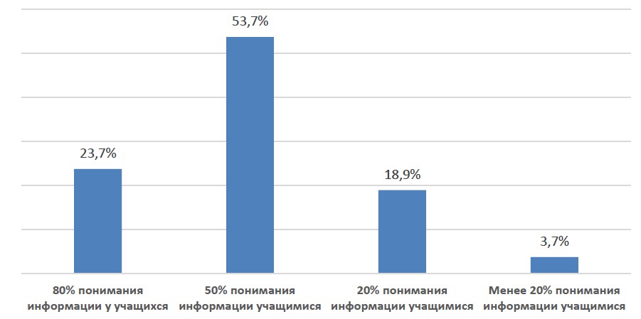 As a result, the low level of communicative and subject competence leads to significant losses in the quality of education of foreign students. Our research shows that the maximum (80%) of educational material is understood by only 23.7% of students. Assimilate only 50% of information 53.7% of respondents, 20% of the material is assimilated by 18.9% of students. Less than 20% of the study material is understood by 3.7% of students (Figure 13).