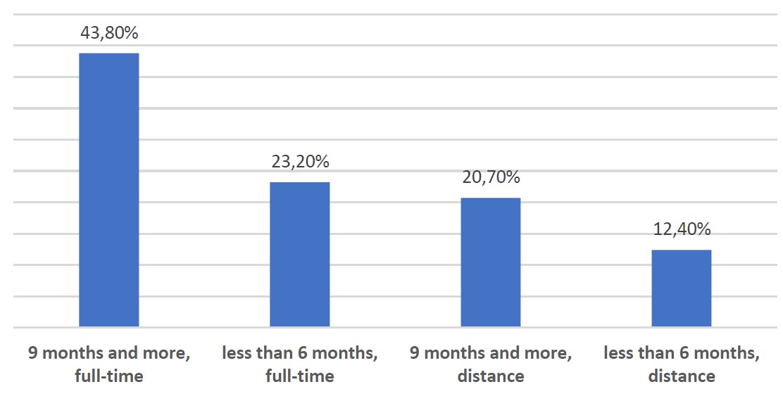According to the data received, 43.8% of the students completed full-time studies at the preparatory faculties of Russian universities lasting 9 months or more. Less than six months of full-time education were attended by 23.2% of students. For 9 months or more, 20.6% of foreigners had distance learning, and for less than 6 months, 12.4% had distance learning (Figure 2).