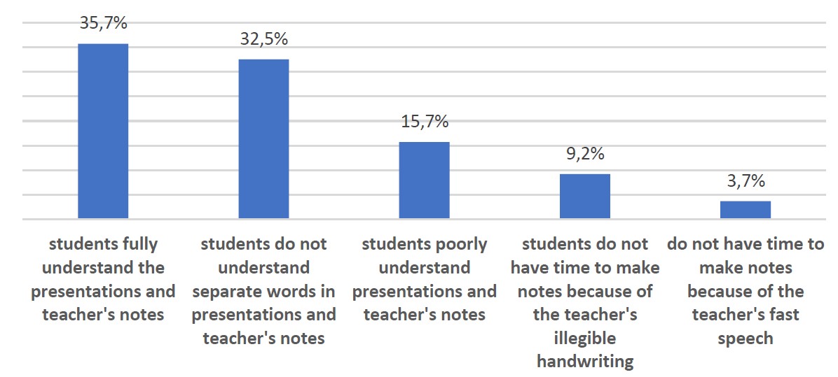 The monitoring showed that only 35.7% of foreign students understand well the texts of presentations and notes of the subject teacher. Do not understand separate words 32.5% of respondents. Poorly understand the texts of presentations and notes of the lecturer 15.7%. A small number of students do not have time to understand the text of presentations and instructor's notes – too fast pace of presentation (6.9%). At the same time, 9.2% do not understand the notes because of the teacher's illegible handwriting (Figure 5).