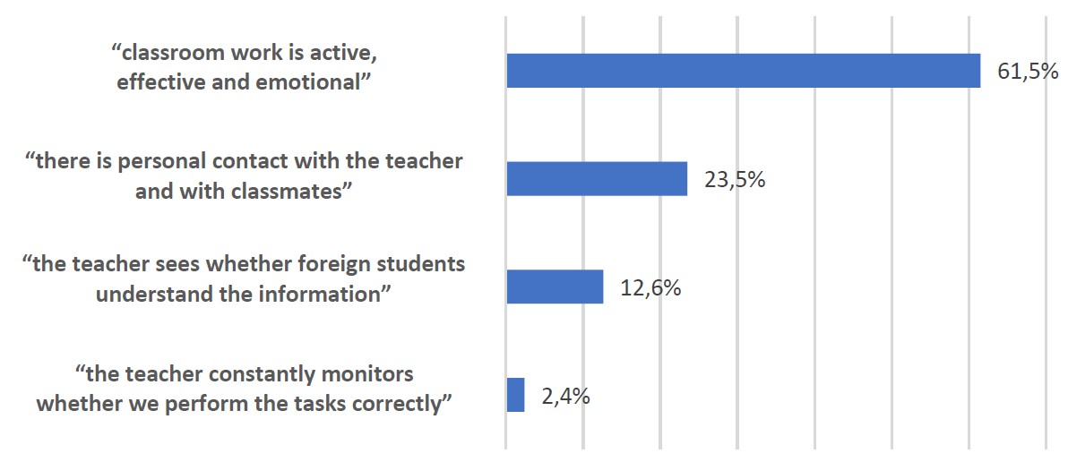 When asked how it is easier to listen to lectures, the vast majority of international students chose full-time (face-to-face) format (78.8%). Preferred distance lessons 21.2% of respondents. It is interesting that regular surveys conducted by the sociological service of RUDN University among Russian students show almost equal preferences for face-to-face and distance learning formats. Foreign students gave the following reasons for classical full-time lessons: “classroom work is active, effective and emotional” (61.5%); “there is personal contact with the teacher and with classmates” (23.5%); “the teacher sees whether foreign students understand the information” (12.6%); “the teacher constantly monitors whether we perform the tasks correctly” (2.4%) (Figure 6).