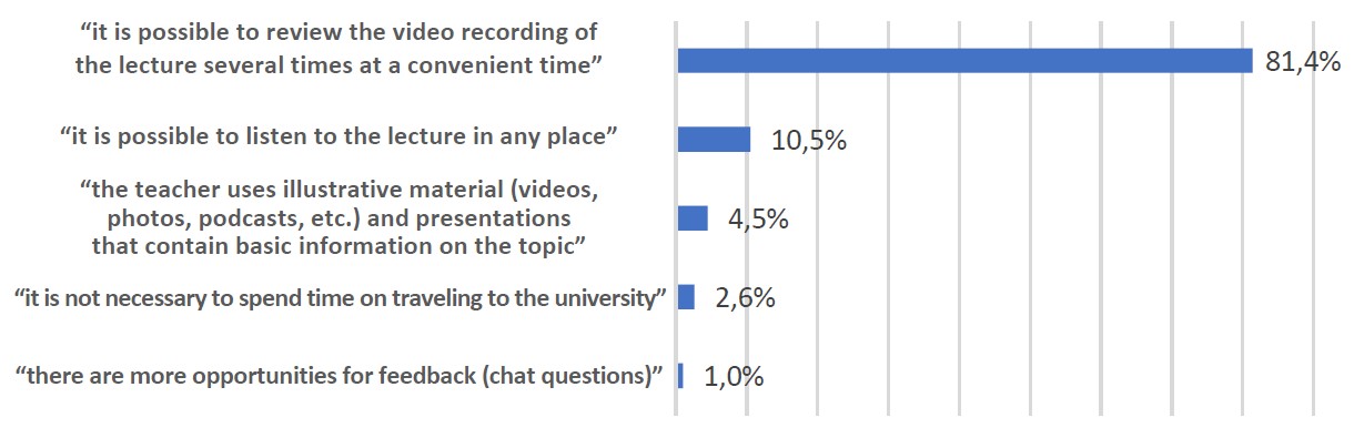 The following arguments were given for distance learning: “it is possible to review the video recording of the lecture several times at a convenient time” (81.4%); “it is not necessary to spend time on traveling to the university” (2.6%); “it is possible to listen to the lecture in any place” (10.5%); “the teacher uses illustrative material (videos, photos, podcasts, etc.) and presentations that contain basic information on the topic” (4.5%); “there are more opportunities for feedback (chat questions)” (1%) (Figure 7).