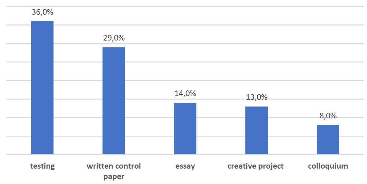 Testing was considered the best form of monitoring (36%), probably because of the widespread use of this form of control in most national academic systems. Next come written control paper (29%), essay (14%), creative project (13%). The colloquium (8%) is considered the most inefficient form of control (Figure 9).