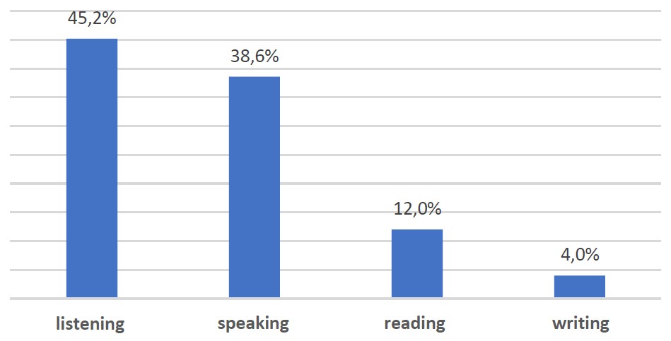 As we see, the students consider the most significant cause of difficulties in their training is the insufficient level of knowledge of the academic Russian language, i.e. the irregular skills of Russian-language communication in the educational and professional sphere. The data show that the most complicated type of speech activity for respondents is academic listening, i.e. perception and understanding of lectures on major subjects in Russian. Find it difficult to listen and understand lectures 45.2% of foreigners. The second most difficult type of speech activity is speaking: the ability to speak and answer the teacher’s questions at seminars (38.6%). Academic reading is the following in terms of the difficulty: reading, semantic analysis, etc. of textbooks and manuals in major subjects (12%). Academic writing (4%) is the least difficult for foreign students in the first year (Figure 11).