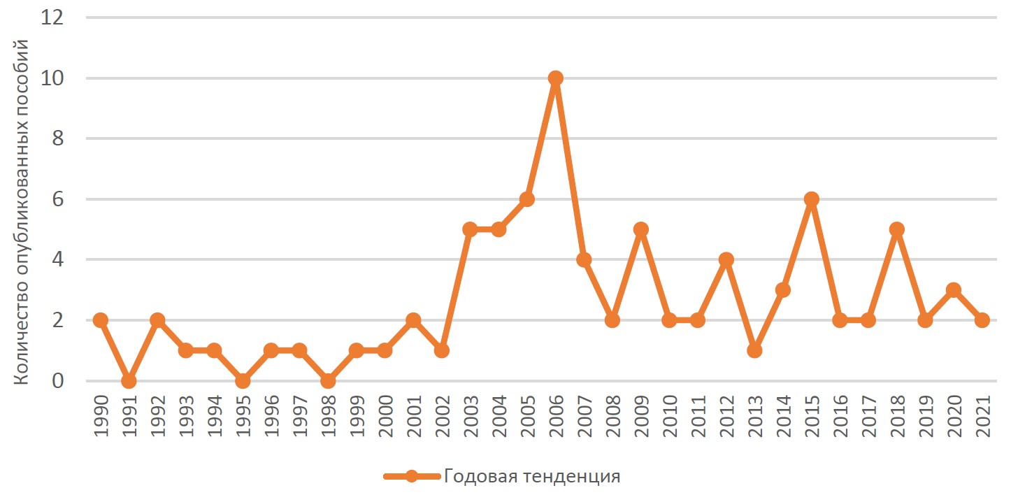 Ежегодный рост количества пособий. Анализируя количество ежегодно публикуемых пособий по чтению в период с 1990 по 2021 г., можно выделить несколько этапов (рис. 1):
