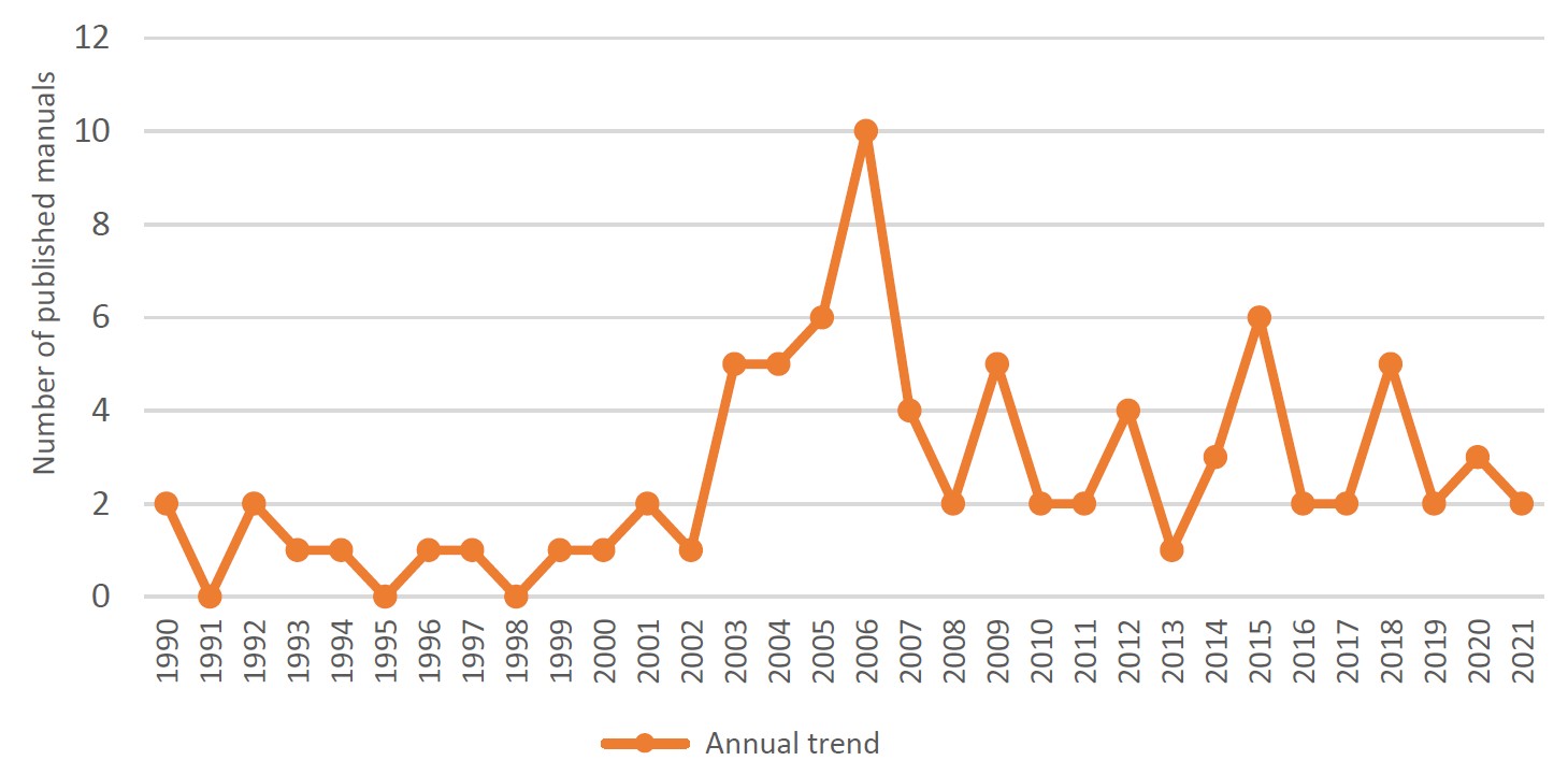 - 1990–2002 гг.: количество опубликованных пособий невелико и относительно стабильно, в большинстве случаев было издано менее двух пособий в год;