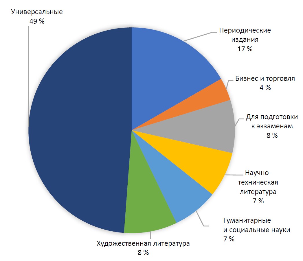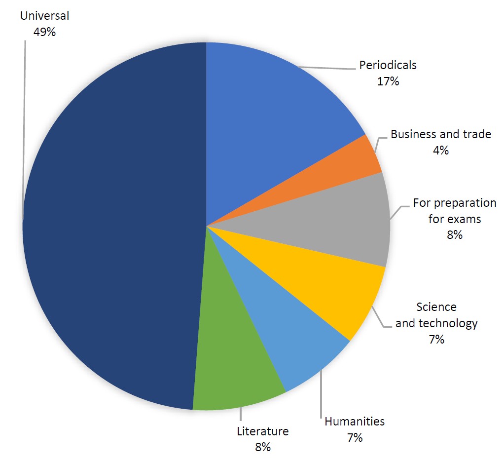Профессионально-специализированные пособия по чтению на русском языке в основном включают следующие категории контента: новости из периодических изданий, тексты из сферы бизнеса и торговли, материалы для подготовки к экзаменам, научно-техническая литература, тексты гуманитарной и социальной направленности, художественный анализ произведений русской литературы. Среди отобранных учебных пособий 43 единицы представляют собой профессионально-специализированные пособия, что составляет 51 % от всего количества пособий по чтению на русском языке. Большинство из них (14 единиц) – пособия по обучению чтению периодических изданий, что отвечает требованиям Программы 2003 и 2012 гг.: чтение российских газет и периодических изданий (включая новые средства массовой информации, такие как интернет) является обязательной дисциплиной для обучающихся по специальности «Русский язык» в колледжах и университетах. Другие специализации содержания учебников по чтению представлены на рис. 2.
