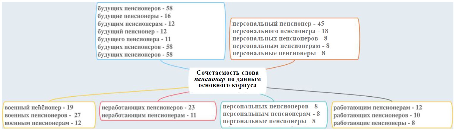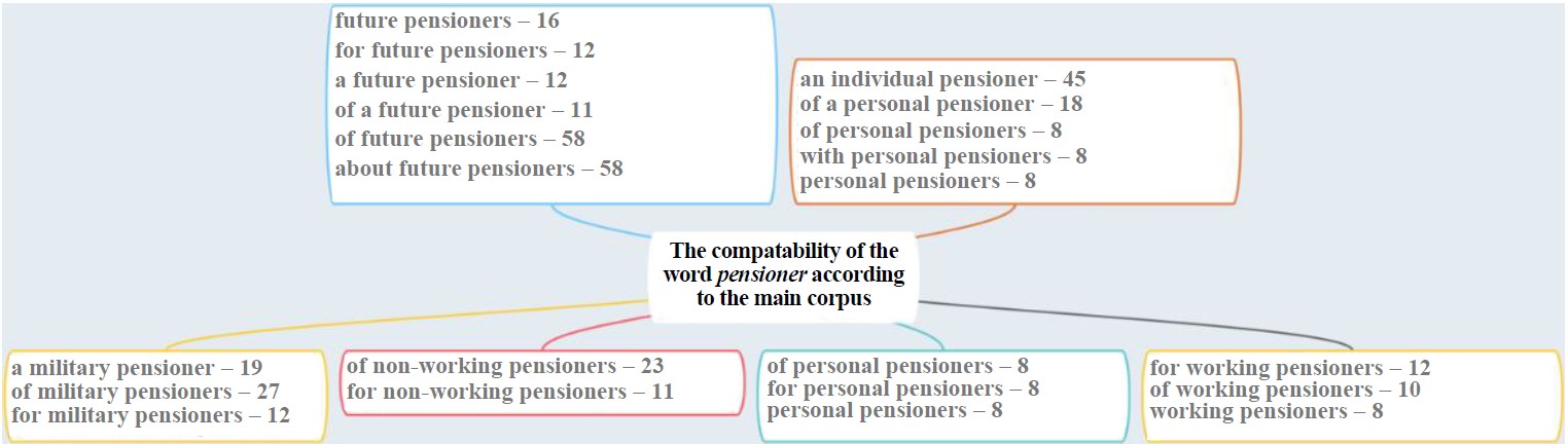 In the main corpus of the National Corpus of the Russian Language, the word pensioner occurs 4089 times. The regular combination of the word pensioner is presented in Figure 2.