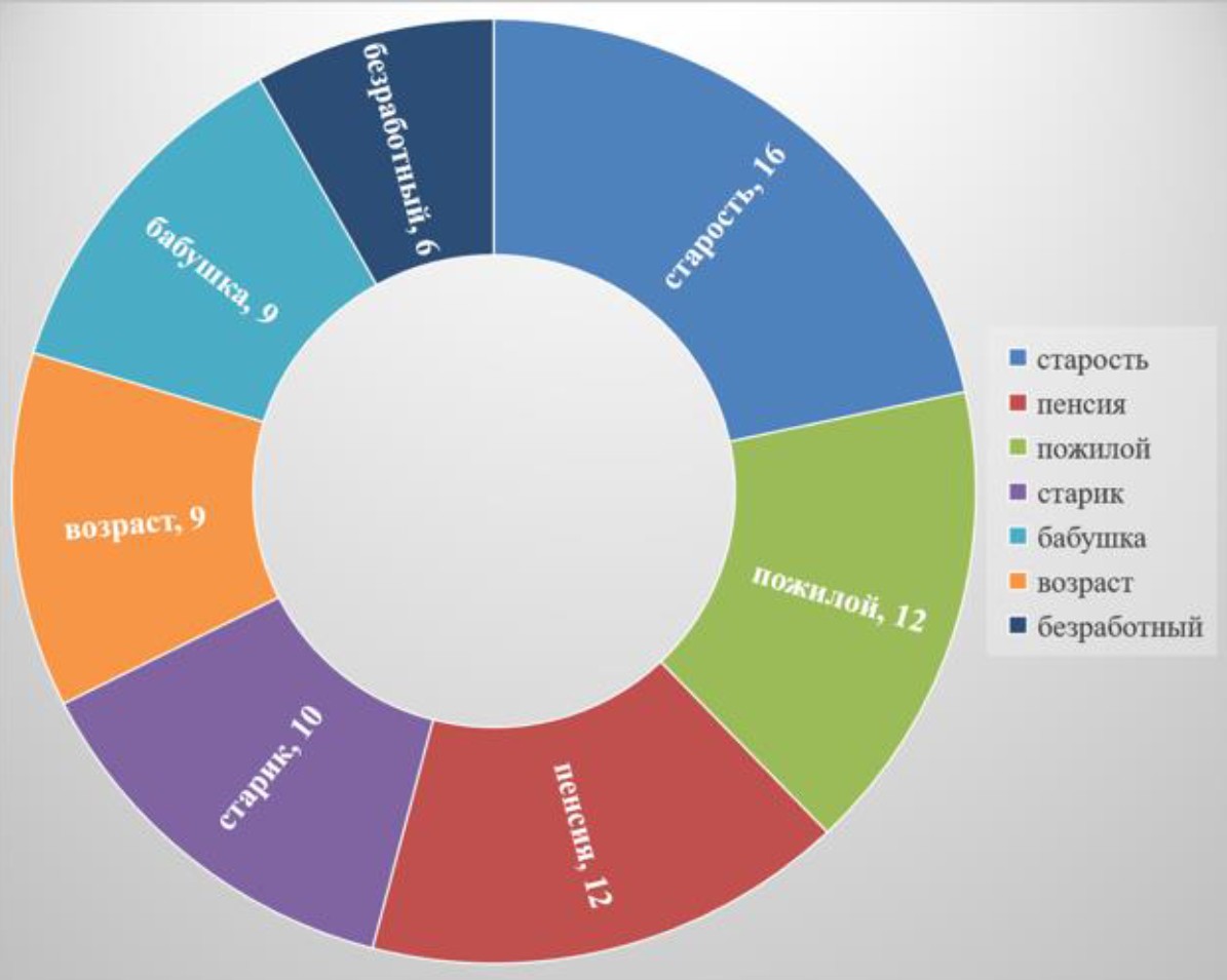 Thus, the words old age, pension, pensioner were proposed as stimulus words. Associative experiments with the stimuli pensioner and pension were conducted for the first time: there are no above-mentioned stimuli in the associative dictionaries of the 20th century. Since associative-verbal networks of the words old age and pension were described in detail in our studies (Safaralieva, 2021; Denisenko et al., 2022), we will present the main results of the study.