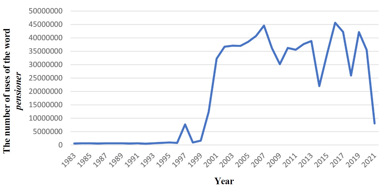 The analysis of the peaks of the lexeme pensioner in the newspaper corpus from 1983 to 2021 leads to the following conclusions: the 2019 reform exposed an acute problem specifically for non-working and single pensioners. The word combinations lonely and non-working pensioner reveal the highest frequency of use. The combination of pre-reform peaks – 2007 and 2016 – indicates the extreme financial situation of pensioners and the protest mood of the population.
