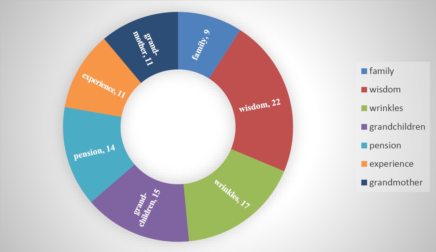 Old age 16; pension, elderly 12; old man 10; grandmother, age 9; unemployed, home 6; poor, grandfather, money, loneliness 5; poverty 4; benefits, single, allowance, family, old, respect, person 3; helpless, veteran, sadness, grandfather, kindness, bench, wrinkles, man, vegetable garden, rest, glasses, help, work, freedom, work experience, old people, theater, labor, household, khrushchevka 2; bus, aggression, activity, active, pharmacy, poor, eat without salt, defenseless, free travel, helplessness, illness, ex-employee, aged, cheerful, grandchildren, military, opportunity, volunteer, nagging, pay, seniority, newspaper, hero, hungry, state, rudeness, risk group, dacha, Victory Day, village, cheap food, softie, flabby, Europe, pathetic, pity, cheerful, life, merit, honored, immigration, disability, history, qualification, cap, books, end, crutch, jacket, drugs, little mobility, manipulation, place, lots of free time, wise, martyr, cash, tension, discontent, German, injustice, unhappy, beggar, needy, limitation, alone, lake, October, experience, experienced, vacationer, passport, rest, hospital, decent, loss, post office, elderly, privilege, travel, worker, indifference, relatives, fishing, market, self-sufficient, gray hair, orphan, bench, scandal, Nordic walking, weakness, weak, word, old purse, old man, pills, television, wasting time, cane, difficulties, fading, smile, smarts, wise, tired, tiredness, to get tired, morning, pinch, dialogues for hours, economy, apples 1.