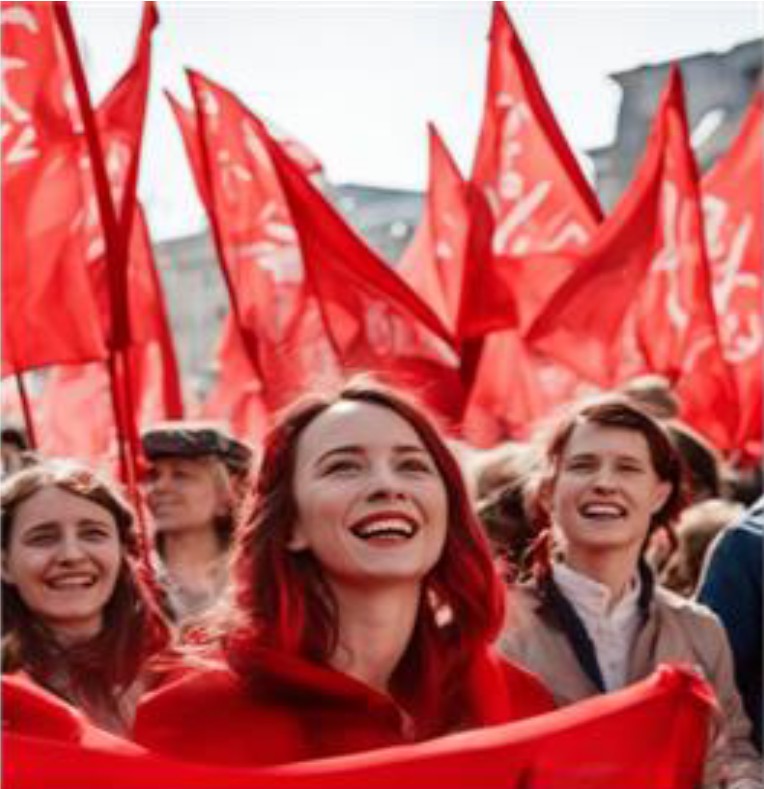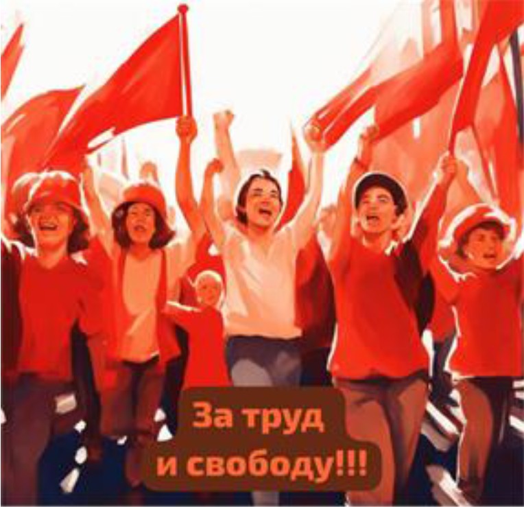 Обучающимся предлагается после изучения микротемы о Первомае в Советском Союзе и основных праздничных атрибутах (демонстрация, плакаты, открытки) при помощи рекомендуемых генеративных моделей (Шедеврум, Kandinsky) подготовить плакат или поздравительную открытку, сопроводив их текстом. Перед выполнением задания преподаватель обсуждает со студентами, что может быть включено в изображение, перечисляются основные языковые единицы, которые могут использоваться в формулировке запроса информации (промпт, или промт): весенний майский день, демонстрация, радостные лица людей, красные флаги, транспаранты, цветы. Задание предполагает также создание лозунга для плаката и/или текста поздравления (в зависимости от избранного жанра) по предложенным образцам. Примеры выполнения заданий студентами приведены на рис. 1 и 2.