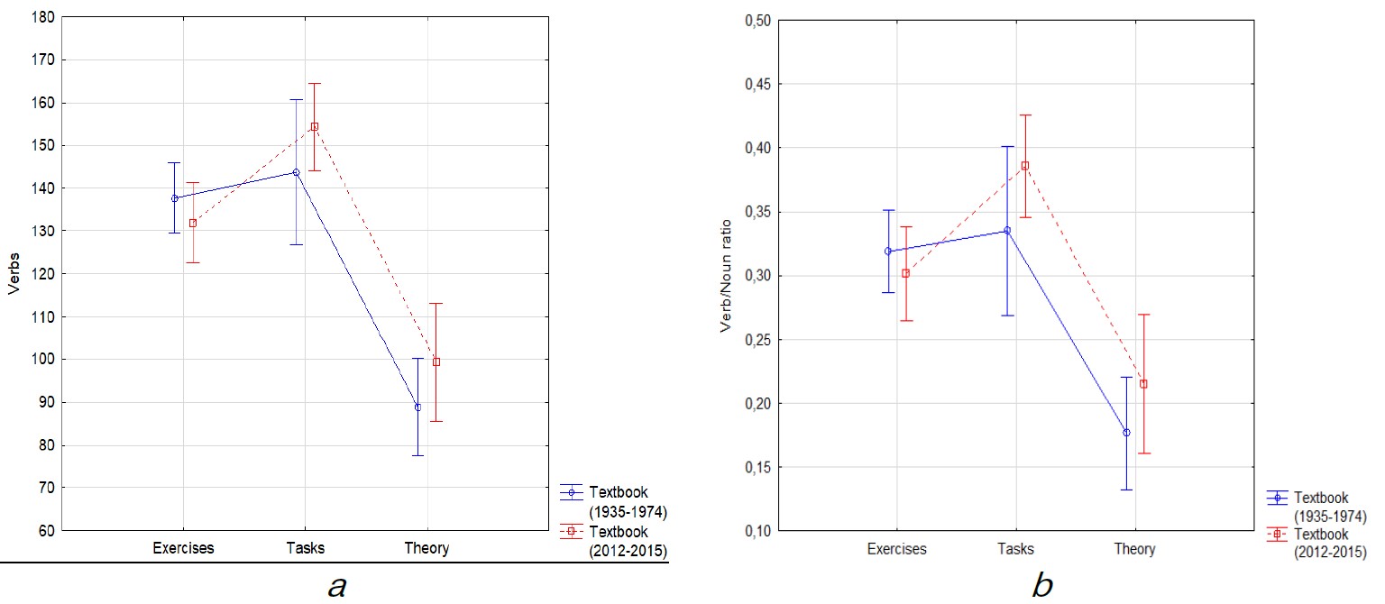 Figure 4. Verb usage patterns in textbook formants: a — number of verbs; b — narrativity (verb/noun)