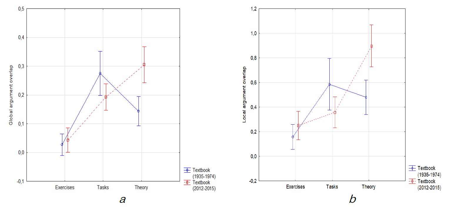 Figure 7. Overlap measures in textbook formants: a — global argument overlap; b — local argument overlap