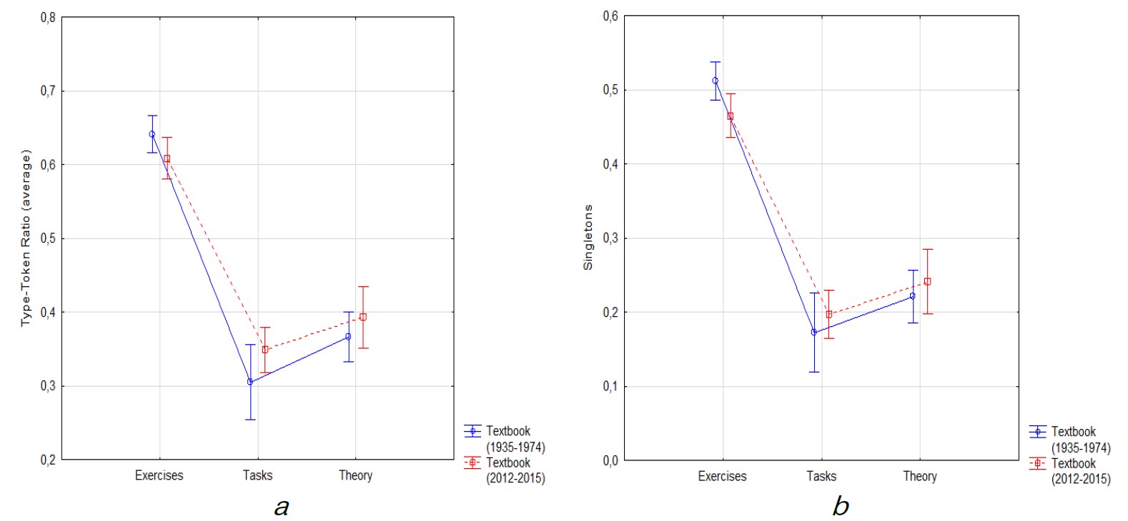 In both periods, the TTR is lower in the 'Tasks' compared to the 'Exercises' and 'Theory', which indicates greater lexical variation (Fig. 8). This could be explained by the fact that tasks in textbooks often include phrases and expressions that are repeated to practice and reinforce theoretical knowledge. This repetition leads to a decrease in lexical diversity and consequently to a lower TTR.