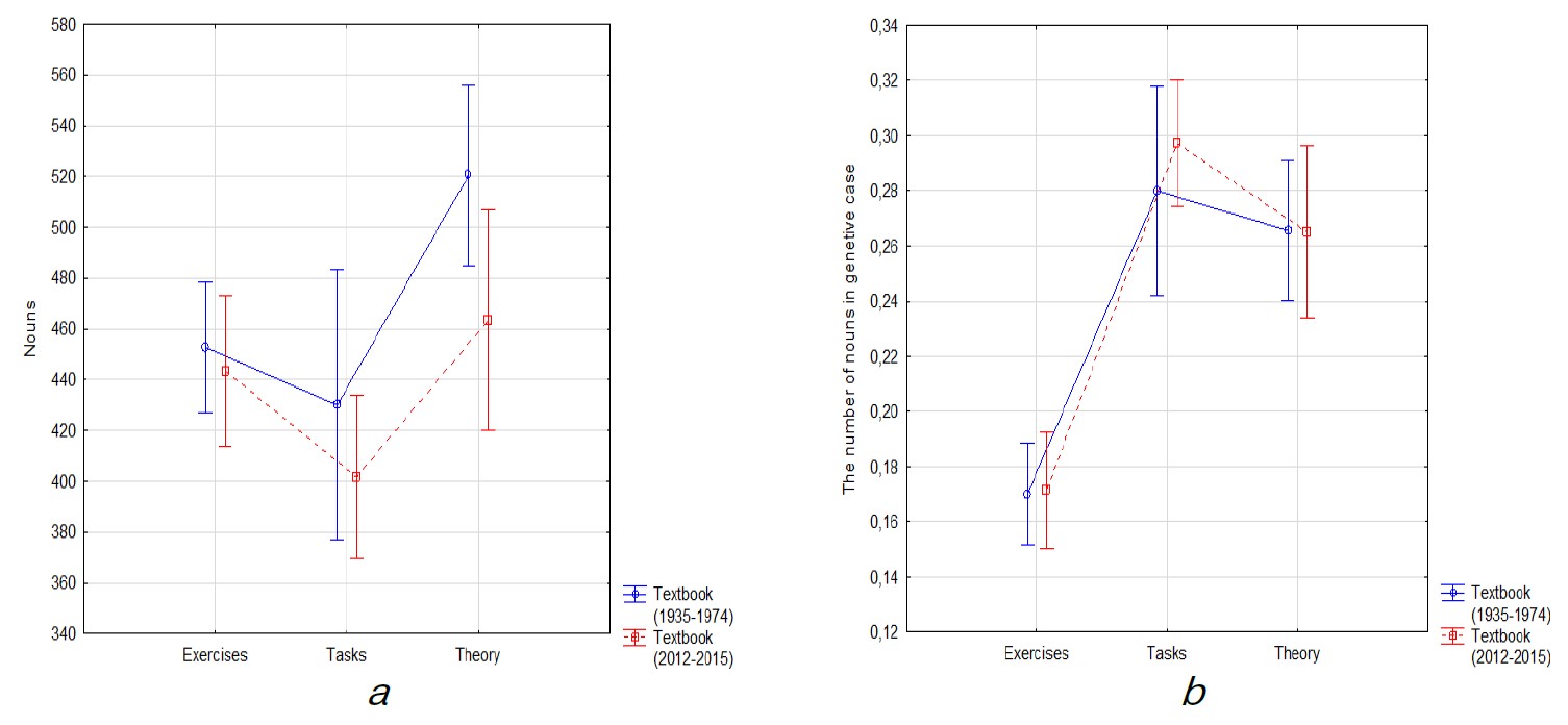 Additionally, all the formants show changes in the proportion of nouns in the genitive case. Case is a morphological means of expressing the syntactic or semantic relationship between the dependent and main components of a word combination (Blake, 2001). In this context, the genitive case of nouns helps clarify belonging, composition, participation, and origin of an object. The increase in the share of nouns in the genitive case may indicate a rise in the number of words specifying and clarifying the meaning of terms in the textbook (Kupriyanov, Bukach, Aleksandrova, 2023). Consequently, the frequent use of the genitive case in the ‘Tasks’ and ‘Theory’ contributes to a more comprehensive elucidation of the theoretical regularities of the Russian language and the semantic content of the tasks.