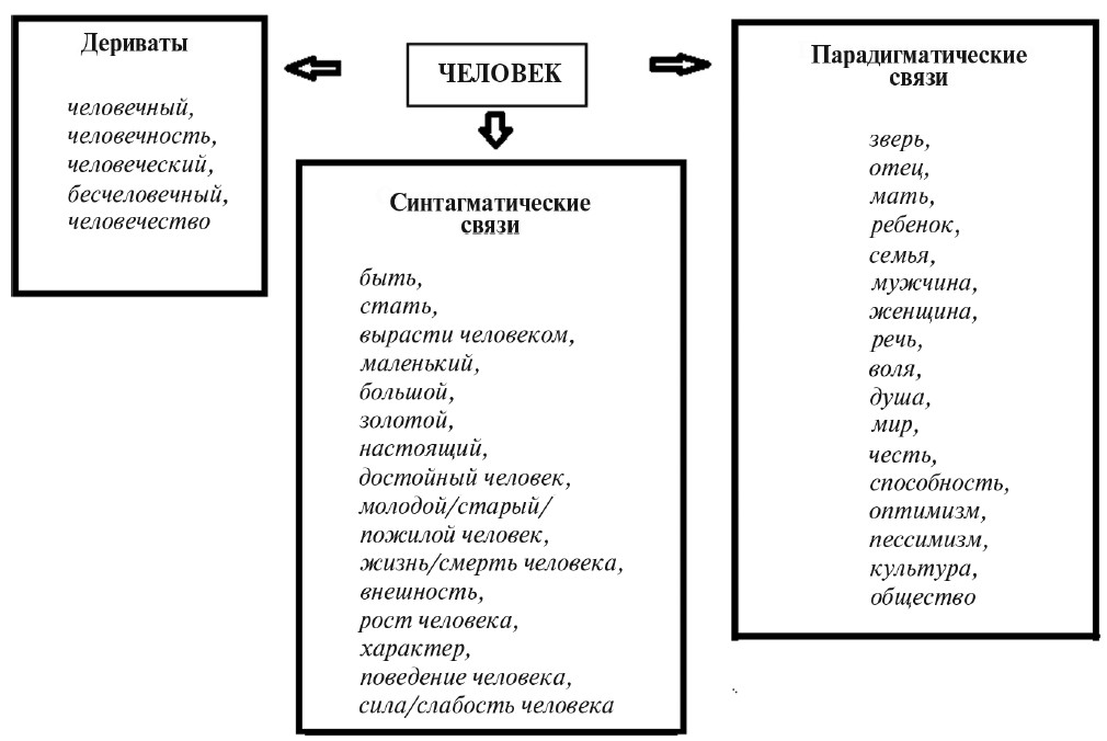 Paradigmatic associations for the word “time” outline the thematic field of the lexeme, including seasonality (seasons and days), orderliness (schedules, plans), history, age, time as a grammatical category and the ways of its expression, etc.