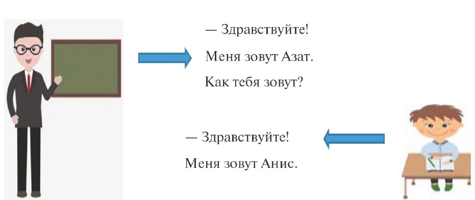 - на принцип интерактивности, «предполагающий взаимодействие речевых субъектов в учебном процессе — преподавателя и слушателя, слушателя и слушателя (Лепик, Устинов, Чабанец, 2019: 453). «Здравствуйте!» — говорим мы при первой встрече с учащимися, при знакомстве с ними, и первый урок — это тоже первая встреча, знакомство с русским языком, которое начинается с самого сложного русского слова здравствуйте. Необходимо повторить это слово по слогам несколько раз: [здра2-ству2й’-т’э2], затем хором отрабатывается его произношение. Преподаватель обращается по очереди к каждому слушателю с приветствием: «Здравствуй!» Слушатель должен ответить на реплику преподавателя: «Здравствуйте!» Для знакомства произносим диалоговые фразы: «Как тебя зовут?», давая образец ответа: «Меня зовут Азат» (рис. 1). Такой диалог преподаватель проговаривает с каждым слушателем. Если кто-то не понимает задания, преподаватель объясняет жестами: указывая на слушателя, произносит: «Как тебя зовут?» А потом указывает на себя: «Меня зовут …».