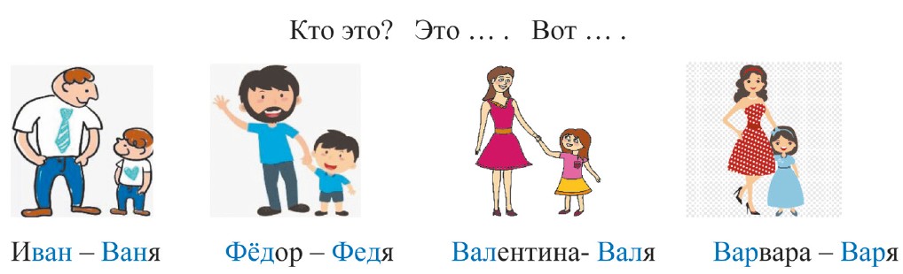 - принцип наглядности, предполагающий обучение путем непосредственного наблюдения над языковым материалом с использованием зрительно-слуховых образцов. Так, на занятии по изучению букв В и Ф слушатели, опираясь на иллюстрацию (рис. 2), знакомятся с Именительным представления (Кто? Что?) имен существительных, а также с образованием уменьшительно-ласкательных форм от полного имени. Обращается внимание на родовую принадлежность слов ВанЯ и ФедЯ (м.р.).
