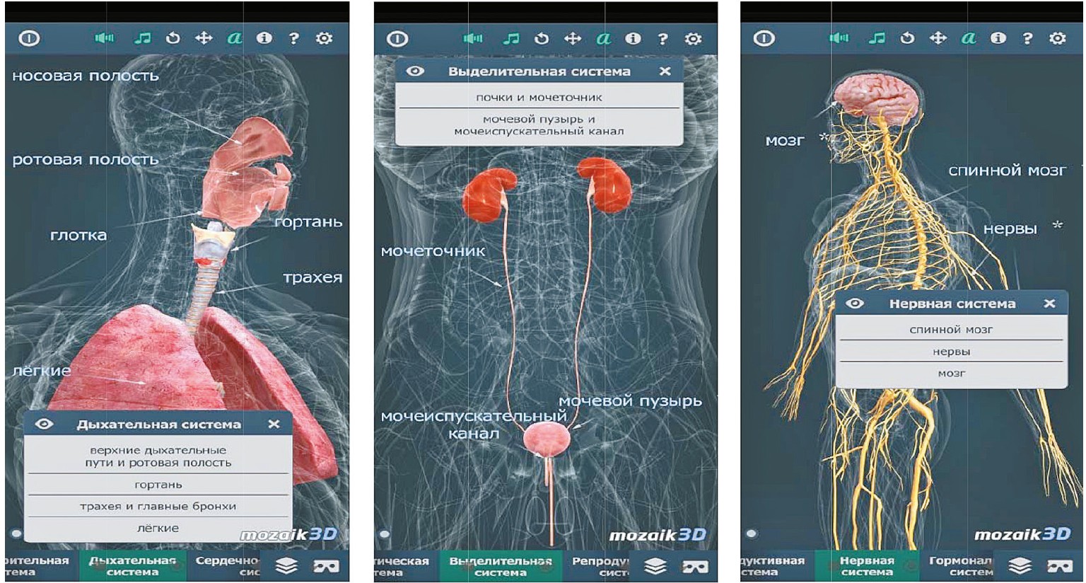 Figure 1. Right to left interactive 3D models of the atlas “Human Body (male) 3D scene”: Respiratory system, Excretory system, Nervous system