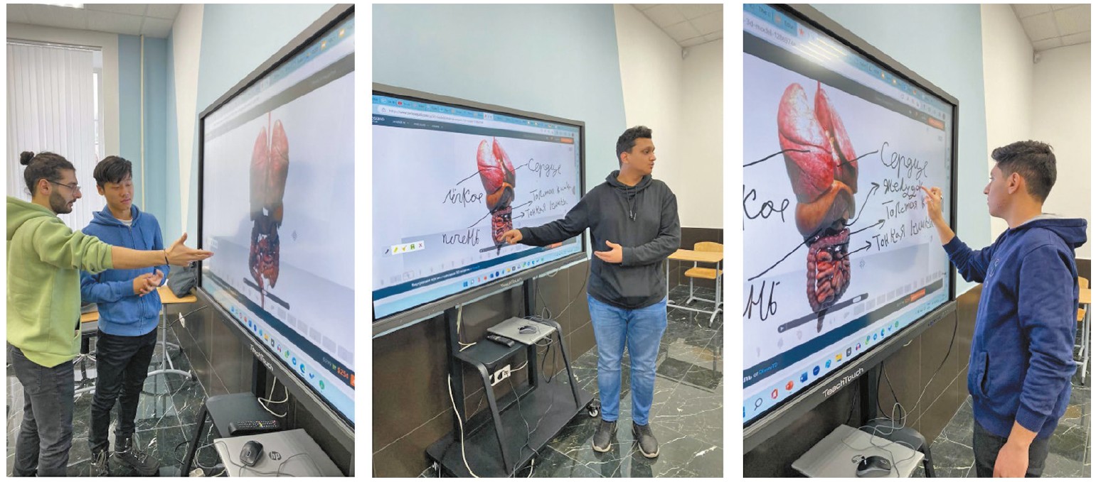 Рис. 2. Иностранные студенты (Иран, Китай, Саудовская Аравия) выполняют различные задания в рамках кейс-метода, посвященного изучению строения внутренних органов грудной и брюшной полостей