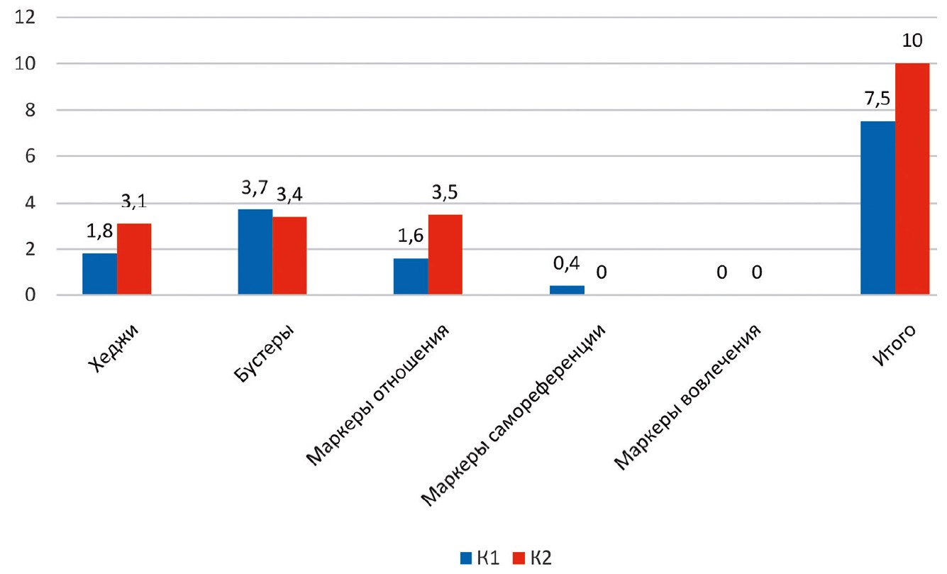 Таким образом, после редактирования тексты магистрантов практически достигли эталонной плотности, однако распределение маркеров в К2 несколько отличается от эталонного.