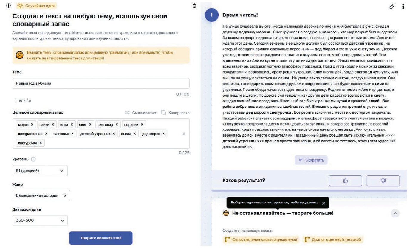 Рис. 1. Создание методической нейросетью Twee учебного текста на тему «Новый год в России» с использованием определенной активной лексики, заданного объема для студентов с уровнем владениям языком А2-В1