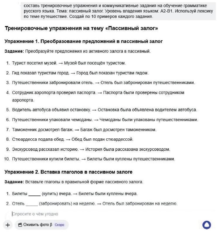 Рис. 2. Создание нейросетью Алиса тренировочных упражнений на овладение пассивным залогом в русском языке