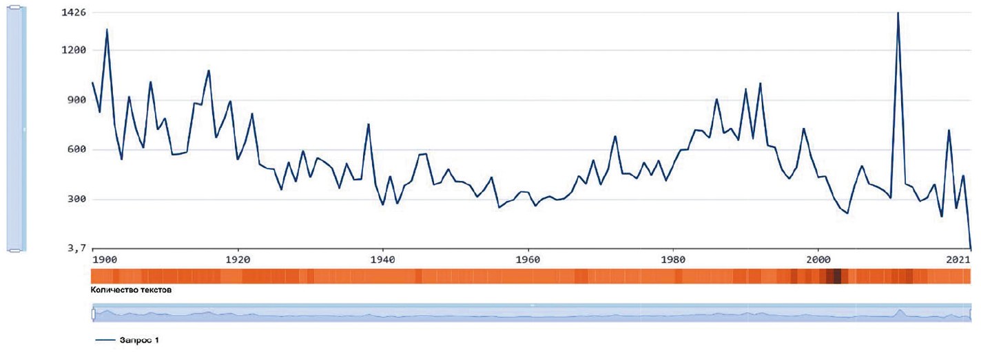 Рис. 2. Частота употребления слова Бог в период с 1900 по 2021 г. (по данным НКРЯ)