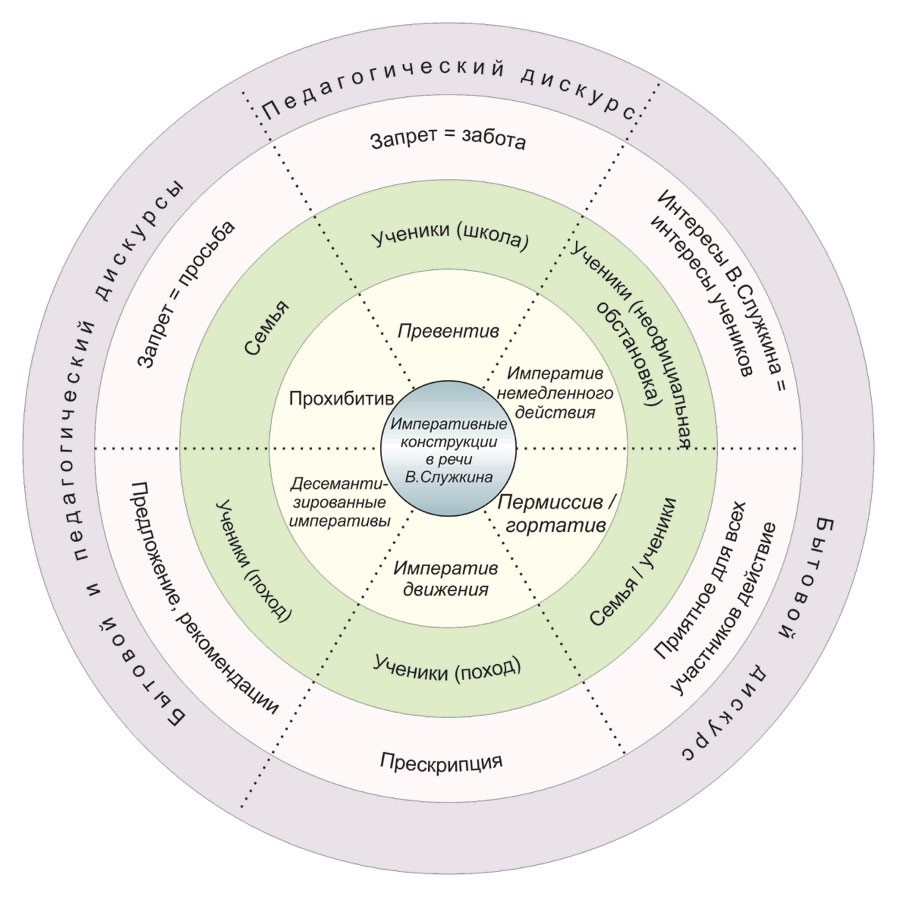 Итак, представим императивные высказывания в речи главного персонажа В. Служкина в виде полевого образования. Считаем ядерным элементом императивные высказывания, а периферийное пространство заполнят типы побудительных конструкций, зависящих от социального статуса коммуникантов, педагогического и бытового дискурса, семантико-прагматических ситуаций, которые ярко характеризуют В. Служкина как языковую личность.