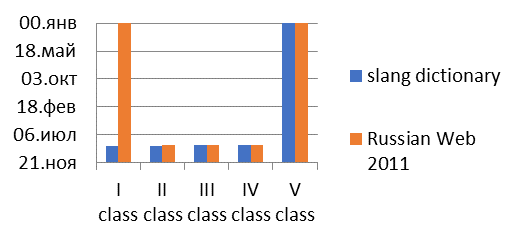 Our implication that the verbs that have their origin in the English language become part of Russian verbal classes and groups has been proved (Figure 2 depicts the percentage representation of slang verbs in the verbal classes):