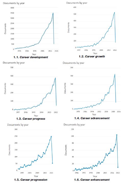 Career advancement and career progression are almost as frequent as career development in research article titles, however, they are significantly less numerous in research papers, even less numerous than career growth across research documents. It is worth noting that career progression is the latest among all terms under consideration since it became popular only in the 1990s. As for collocability, career advancement and career progression have similar occurrence in non-prepositional and right prepositional syntactic structures. Both of them have career mobility as a frequent keyword. However, advancement has indication of career-related progress in dictionaries.