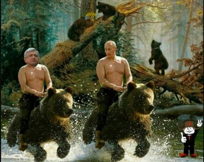Образ медведя используется в странах Латинской Америки во внутриполитическом дискурсе для акцентирования внимания на пророссийской ориентации того или иного политика (действительной или мнимой) его оппонентами. Среди латиноамериканских президентов чаще всего в подобных симпатиях обвиняют президентов Мексики (Андрес Мануэль Лопес Обрадор (2018 г. — наст. вр.) и Венесуэлы (Николас Мадуро (2013 — наст. вр.)). Так, например, широкое распространение в 2018 году получила серия карикатур на Лопеса Обрадора, поводом к созданию которой стали заявления СМИ о вмешательстве России в мексиканские выборы1. В свою очередь, конкурирующие с Морена (Movimiento Regeneración Nacional), партией, созданной Л. Обрадором, Институционально-революционная партия (Partido Revolucionario Institucional, ПРИ)) и Партия национального действия (Partido Acción Nacional, ПАН), обвиняли лидера Морена в получении финансовой помощи из России. На это Обрадор отвечал: “Estoy esperando que emerja el submarino ruso en el puerto de Veracruz porque me trae el oro de Moscu, ya soy Andresmanuelovich. Ahora vivo del oro de Moscú” (‘Жду появления русской подводной лодки в порту Веракрус, привозящей мне золото из Москвы, я же Андреас Мануэлович. Теперь живу на московском золоте’). После этого за новым президентом закрепилось ироническое прозвище ‘Андреас Мануэлович’. Необходимо отметить, что использование данного стилистического приема — сочетания с исконным испанским корнем славянской морфемы — имеет место и по отношению к президенту Венесуэлы [17. C. 49]. В данном контексте в испаноязычных социальных медиа встречаются сочетания образа Лопеса Обрадора с символами России, такими как папаха, водка, матрешка и государственная символика Советского Союза, а также медведем: образ президента Мексики интегрирован в уже известную карикатуру с изображением президента России В. Путина верхом на медведе на фоне картины И. Шиш кина «Утро в сосновом лесу»[1].