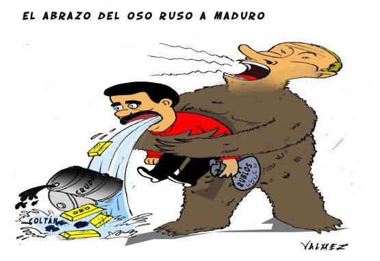 О хитром «русском медведе» и недалеких Мадуро и Чавесе, променявших венесуэльскую долю на мировом рынке нефти на «военный металлолом», пишет оппозиционное венесуэльское издание El Nacional. Статья о коварстве «русского медведя»: «россияне захватили без выстрела каждый сантиметр, оставленный PDVSA»[6], пользуясь страхом авторитарных правительств перед насильственным свержением. В целом, латиноамериканские СМИ используют образ медведя, чтобы подчеркнуть «особые отношения» Москвы и Каракаса. Тема «медвежьих объятий» не обошла стороной и испанские медиа, в частности, каталонское издание Vanguardia проводит аналогию между советско-кубинскими отношениями периода Холодной войны и современными российско-венесуэльскими (о Мадуро): «Крах экономики и, как следствие, нехватка продовольствия и медикаментов… не позволяют ему отказаться от объятий русского медведя»[7].