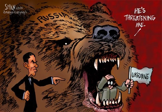 В свою очередь, латиноамериканские СМИ неоконсервативно-неолиберальной ориентации нередко копируют англоязычные карикатурные изображения России-медведя, заимствуя и их интерпретации: так, например, перуанское издание использует образ свирепой России-медведя, пожирающей Украину (карикатура Durango Telegraph 2014 года)[11].