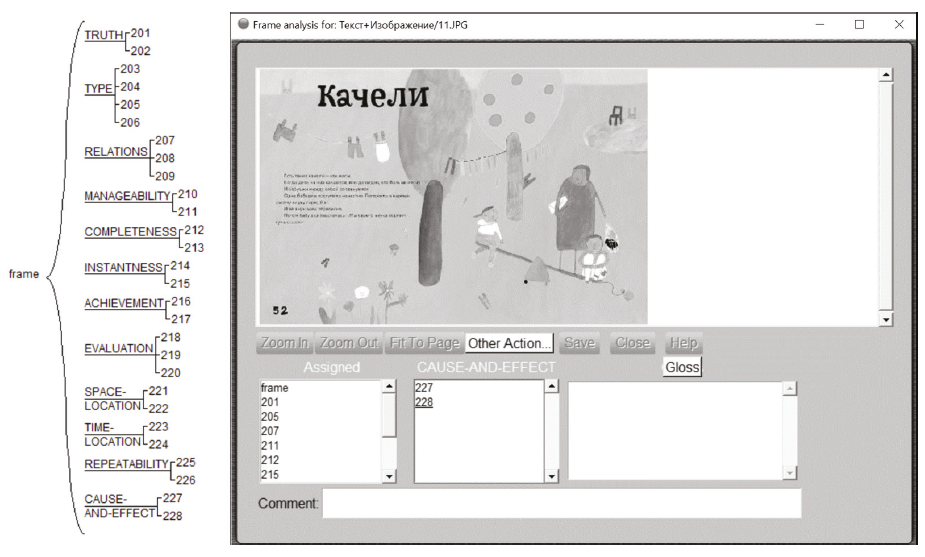 Annotation was carried in UAM Image Tool (www.corpustool.com) which allows to conduct annotation at various levels and annotate image and text separately. The research data are 100 book samples presenting the fragments of text accompanied with illustration, addressed to adults and children. The basic criterion for samples selection was the criterion of diversity, that is the diversity in author and illustrator range, period of issue, style of writing and artistic style, genre of literature, addressee age group. The samples were selected from the works of A. Chekhov, B. Akunin, I. Ilf and Ye. Petrov, S. Marshak, N. Gogol, A. Barto, L. Kaminsky, F. Nonn, E. Tarle, Z. Turlonnas, among others, with illustrations made by Kukryniksy, L. Vladimirsky, V. Chizhikov, R. Bogdanova, I. Oleynikov, A. Bekker, A. Petrova, K. Boldt, V. Vidali, among others. In Figure 2 we demonstrate the structure of Event level and the annotation procedure of the Sample 1 given above.